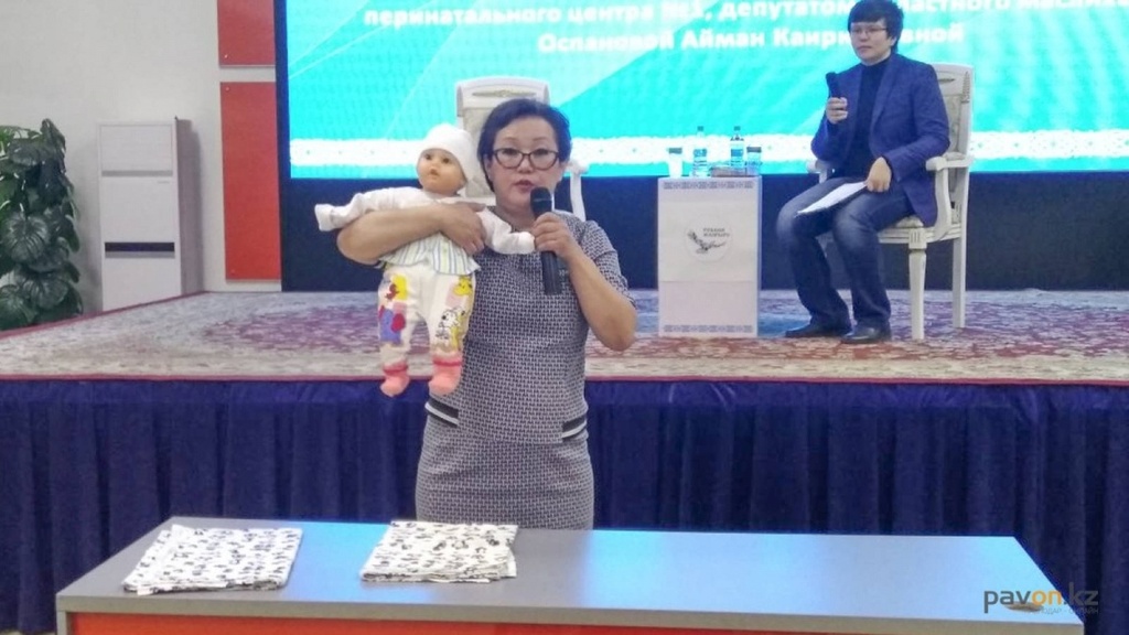 В ходе встречи Айман Оспанова показала студентам мастер-класс по пеленанию младенца, отметив, что сейчас в роддомах новорожденных не кутают в пеленки, однако медсестры и врачи, на всякий случай, должны уметь это делать.