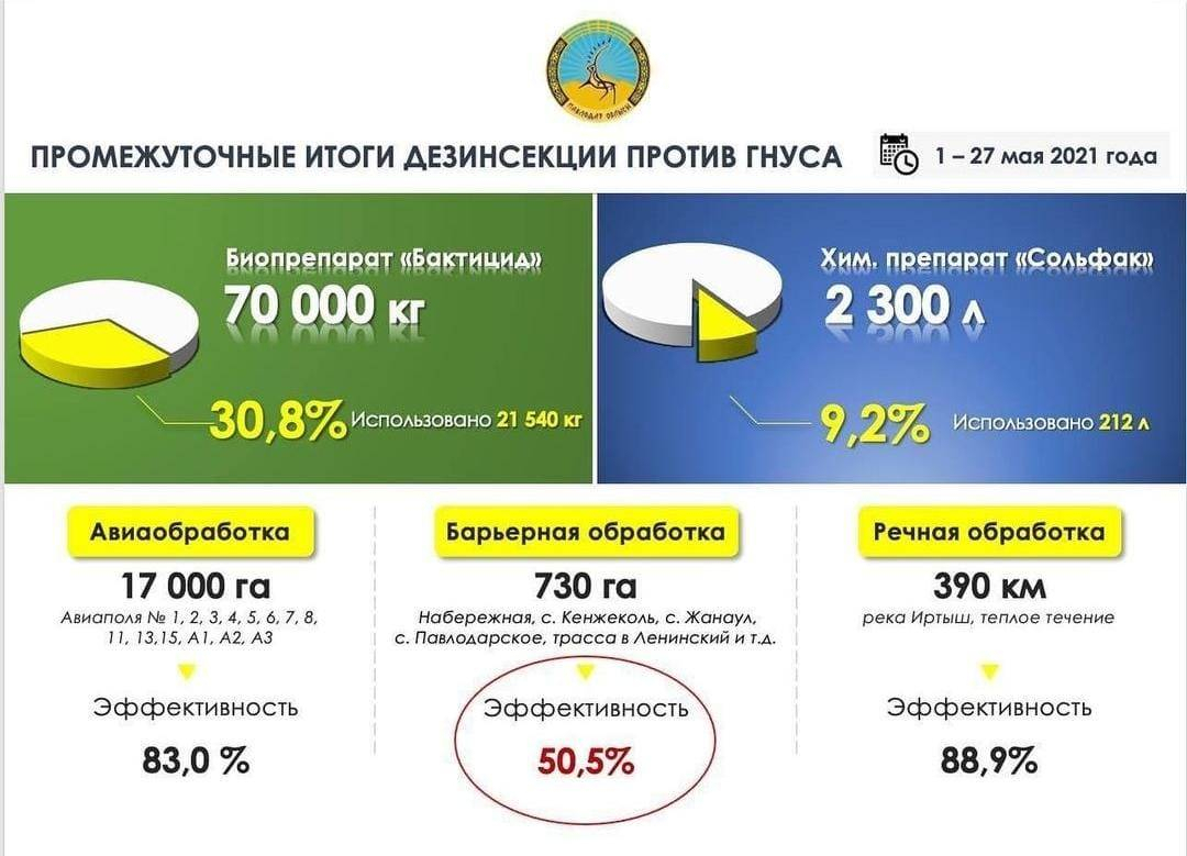 Он также опубликовал промежуточные итоги дезинсекции против гнуса с 1 по 27 мая, согласно которым эффективность авиаобработок, проведенных на территории 17 тысяч гектаров, составляет 83%, барьерной обработки на 730 гектарах - 50,5%, речной обработки на 390 километрах Иртыша, включая теплое течение, - 88,9%.